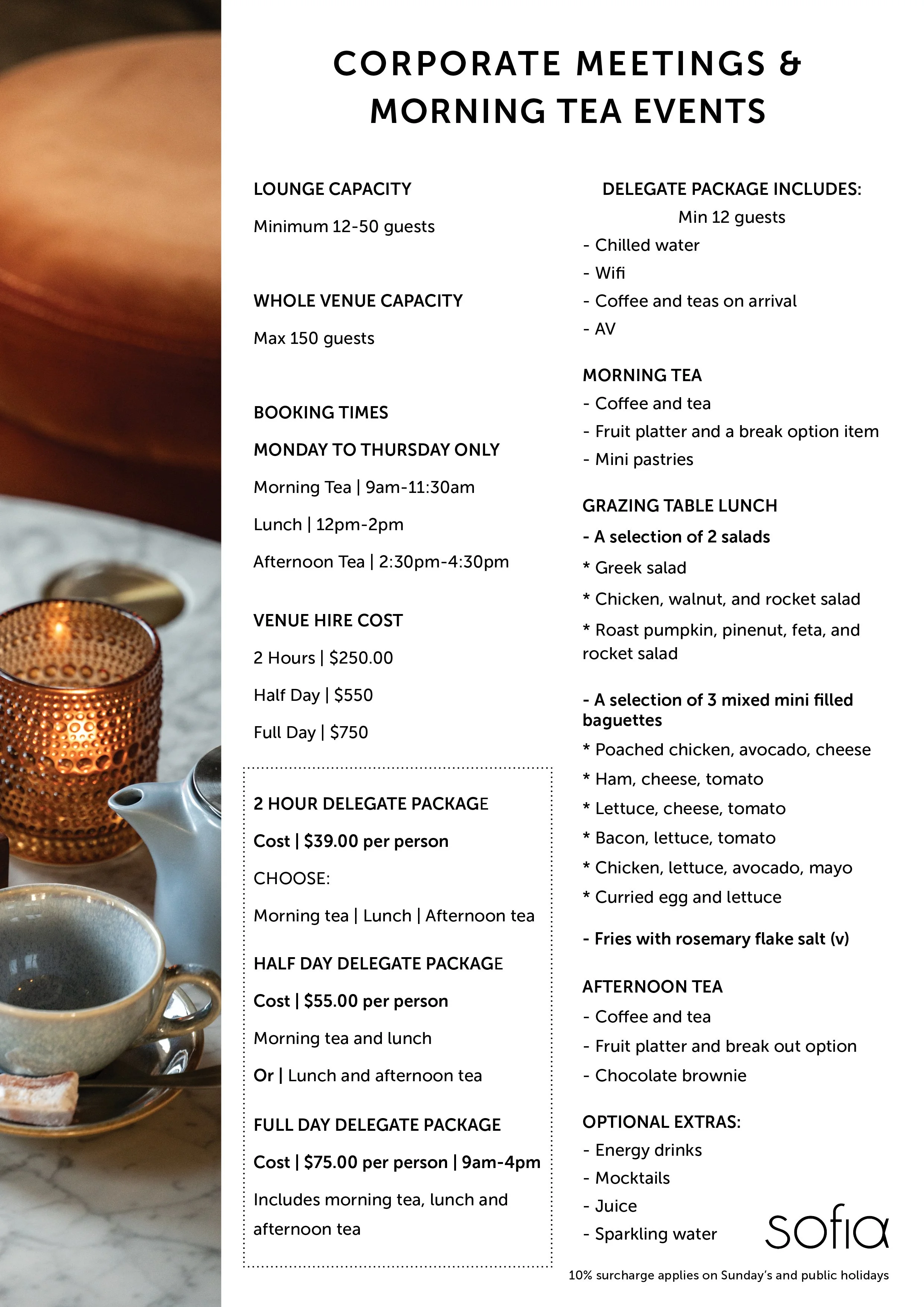 Hold your next corporate event at Sofia between 9am and 4pm. For further information please enquire with our friendly team.